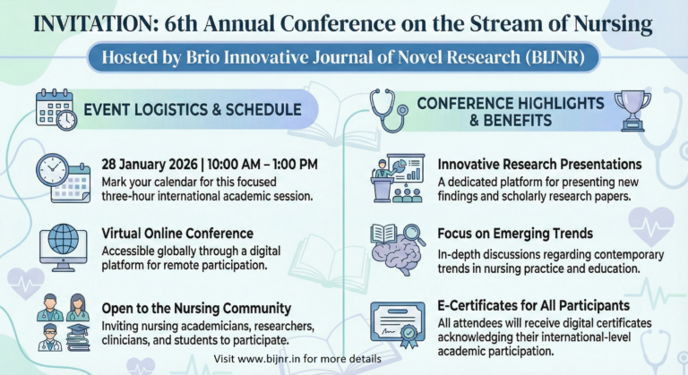 The Brio Innovative Journal of Novel Research (BIJNR) invites research scholars, academicians, educators, and healthcare professionals worldwide to participate in the 6th International Conference on the Stream of Nursing, to be held online on 28 January 2026. The conference provides an international platform for the presentation of original research, innovative practices, and evidence-based advancements across diverse nursing and healthcare domains. Participants will have the opportunity to engage in scholarly discussions, receive expert feedback, and foster global academic collaboration. Interested participants may register by emailing their presentation topic to editorbijnr@gmail.com E-certificates will be awarded to all presenters and participants.