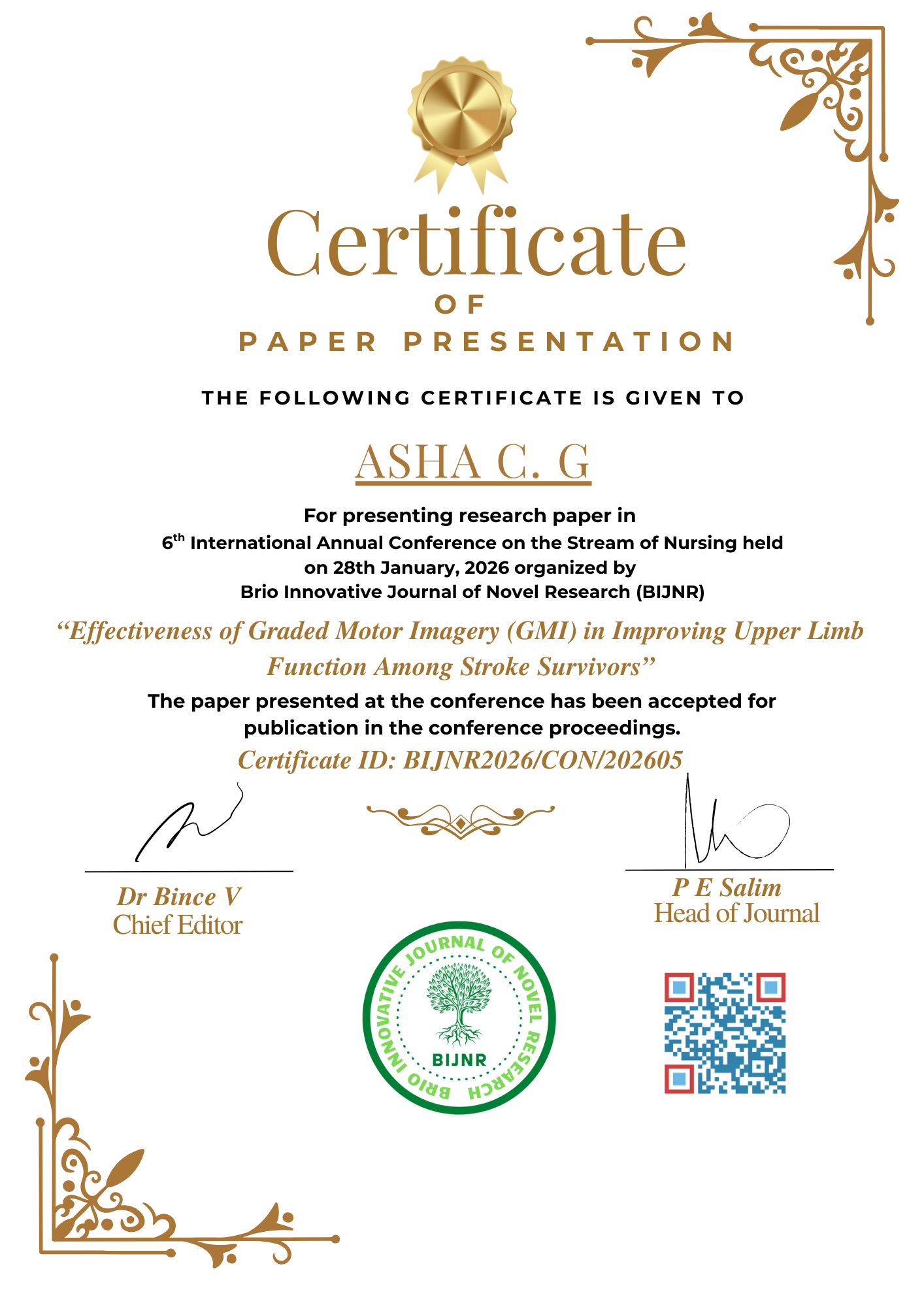 The Brio Innovative Journal of Novel Research (BIJNR) successfully organized its 6th International Conference on the Stream of Nursing on 28 January 2026 through an interactive online platform. The three-hour virtual conference, held from 10:00 AM to 1:00 PM, brought together research scholars, academicians, educators, and healthcare professionals from India and abroad, providing a vibrant global forum for academic exchange.